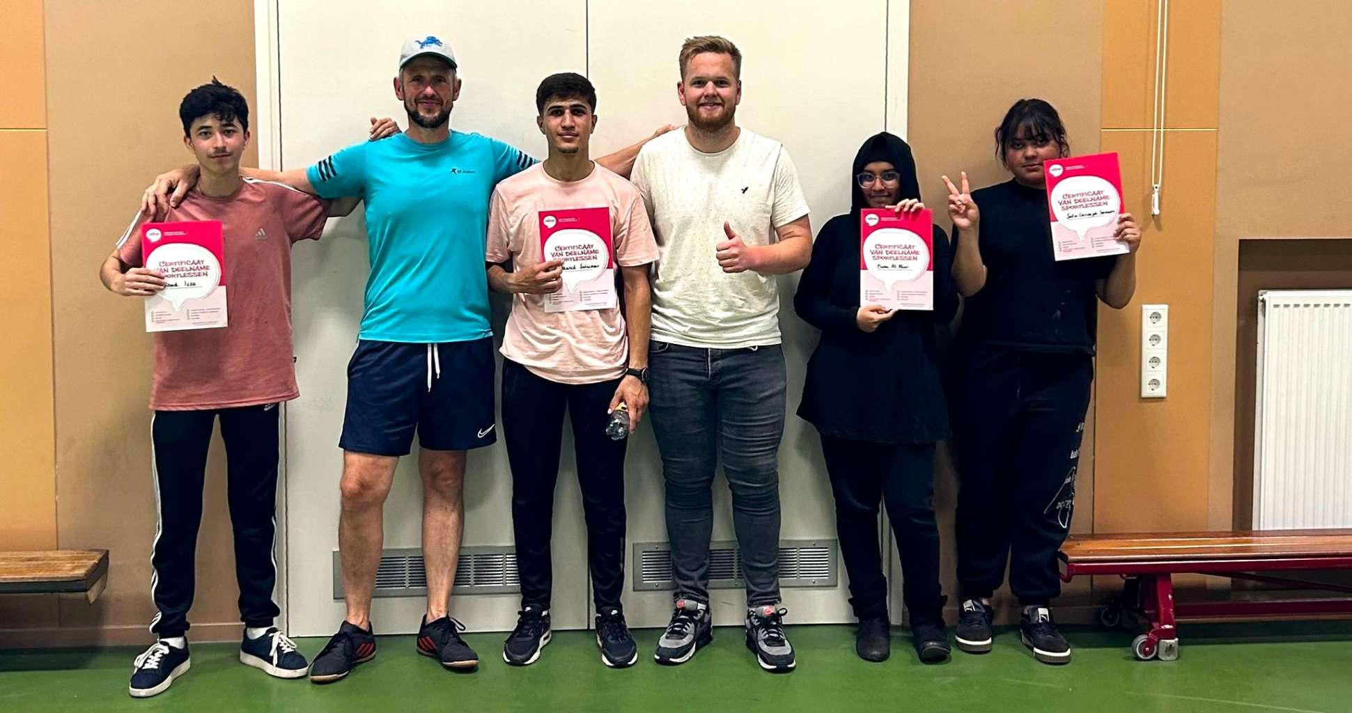 Deze week sloten we het lesprogramma af en ontvingen de deelnemers een certificaat waar ze heel trots op waren. Het programma werd namens het NIVM uitgevoerd door Marc Ensink van KF Action. Hij blikt enthousiast terug op deze periode. ‘Door wat deze kinderen hebben meegemaakt op jonge leeftijd en het feit dat voor velen de cultuurshock van de verplaatsing naar Nederland nog gaande is, hebben we geprobeerd de thema´s zo veel mogelijk op hun eigen realiteit aan te passen. De thema´s zoals vertrouwen, tolereren, veiligheid, positief coachen, balans, hebben we zoveel mogelijk tastbaar gemaakt door een lichaamsgerichte aanpak: weten dat je het kan, omdat je het zelf hebt ervaren. Dus in spelvorm laten ervaren wat het nut van bijvoorbeeld het ´tolereren van andermans gezag´ voor jou kan betekenen. Door middel van vechtsportoefeningen en ook voetbal, hebben we deze jongens en meisjes fysiek ervaringen laten opdoen op het gebied van genoemde thema’s. Niet altijd was er de tijd en aandacht bij deze groep actieve puberende jonge mensen, maar we hebben zeker ‘vonkjes’ van herkenning gezien.’